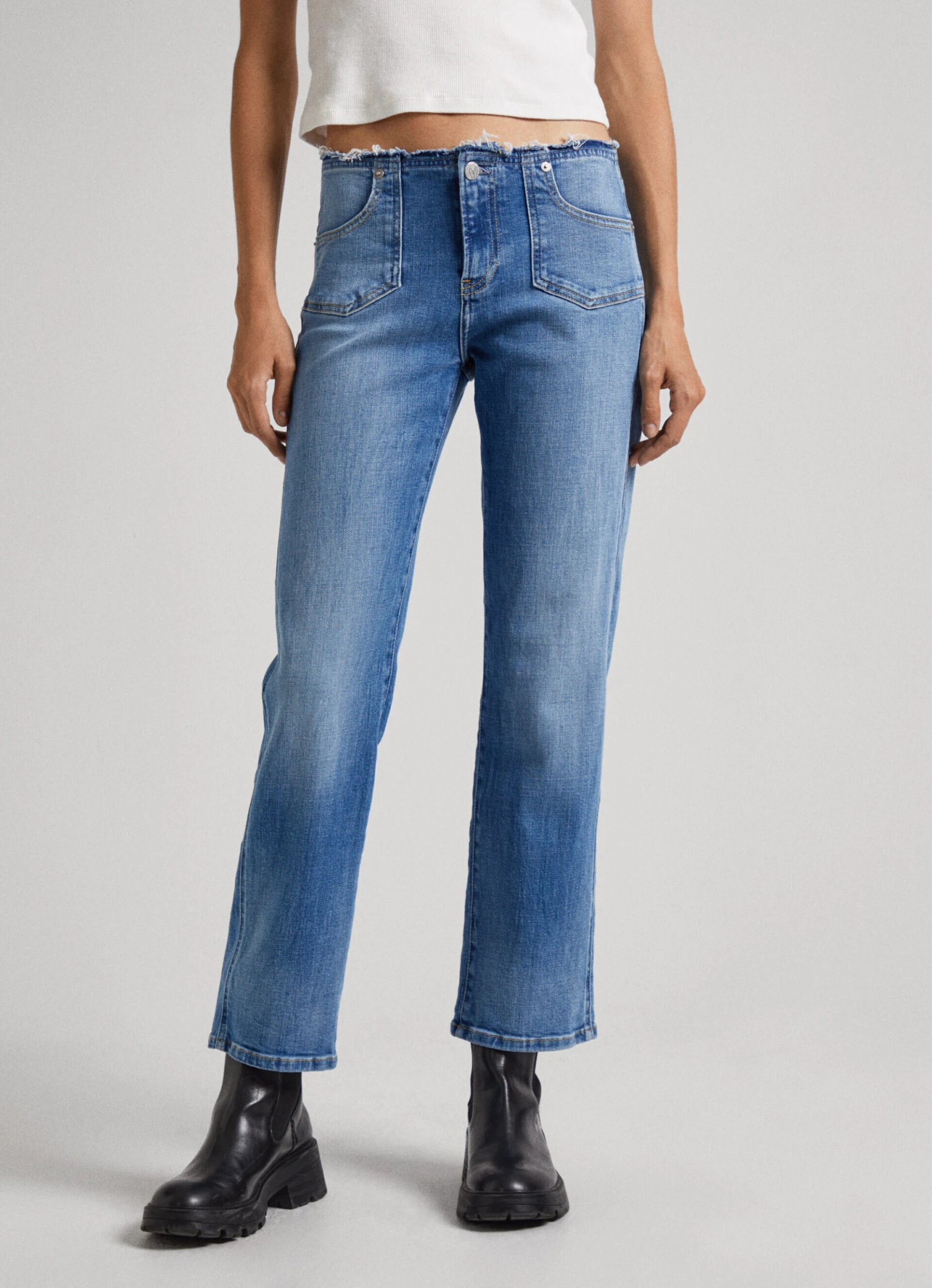 – Raw cut waist in frayed finish
