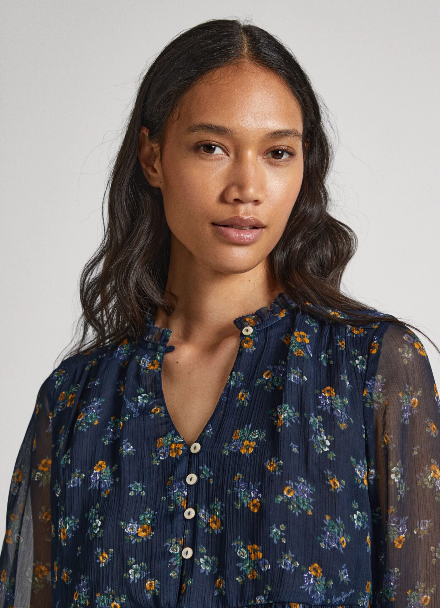 – Mandarin collar with mini ruffles
