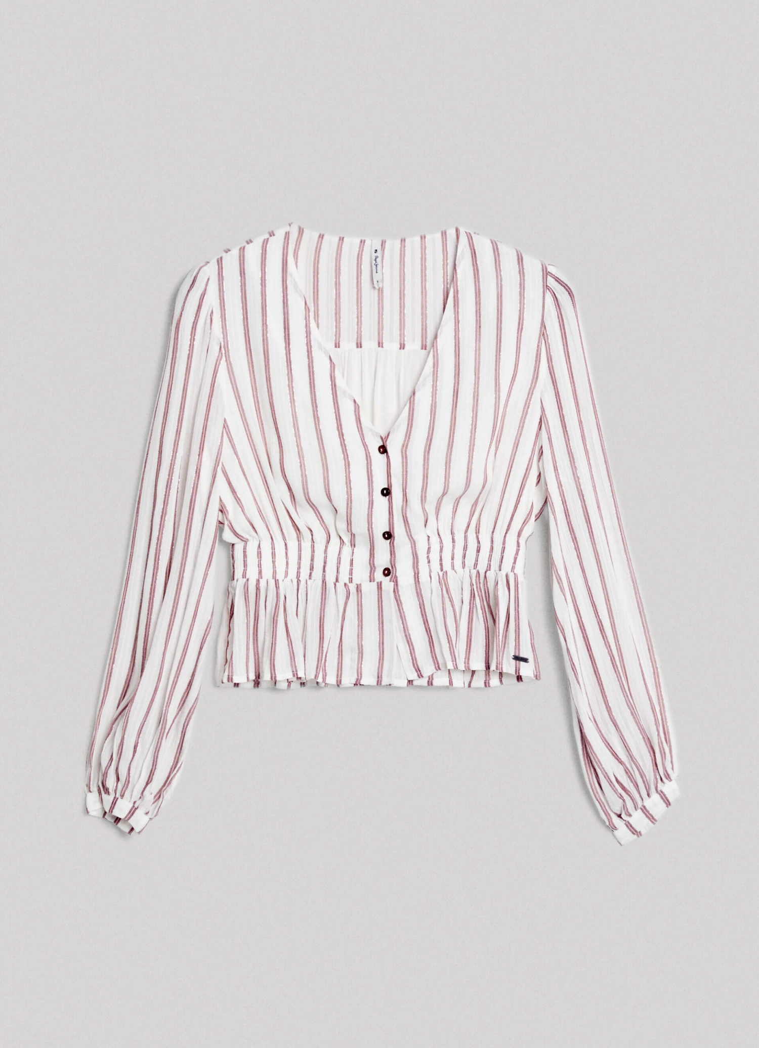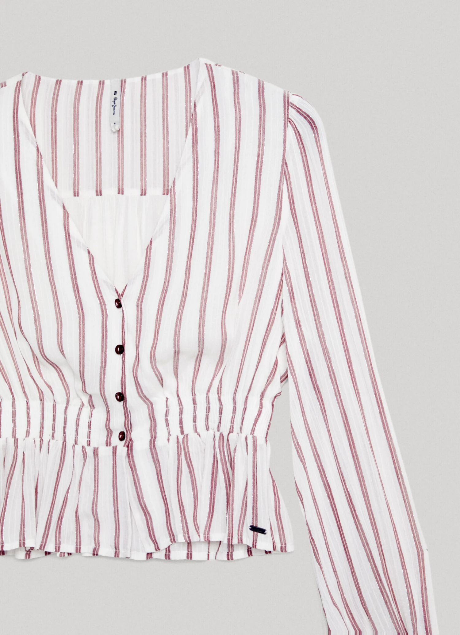 – Buttoned closure below the neckline